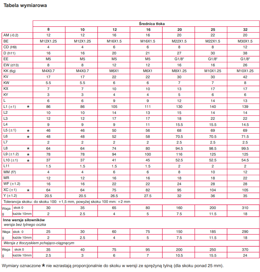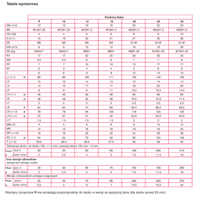 Tabela wymiarowa siłownika: