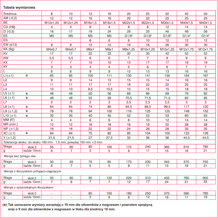Tabela wymiarowa siłownika:
